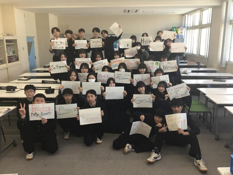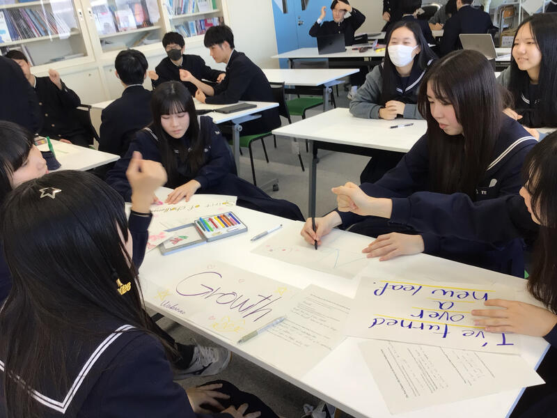 教室を彩ったのは、生徒たちが大きな紙に記した思い思いの言葉たち。"growth"(成長)、"spirit of challenge"(挑戦心)、**"diversity"(多様性)といった力強い単語から、"I turned over a new leaf"(心機一転)という自身の変化を象徴するフレーズまで、多様な感性が溢れ出しました。