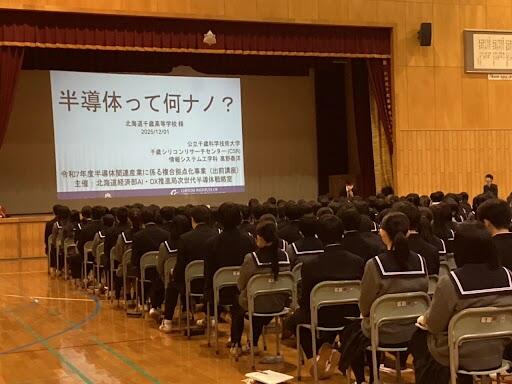 12月1日(月)に1年生(3学科8クラス)を対象に半導体に関する出前講座が開催されました。この事業は北海道経済部AI DX推進局次世代半導体戦略室が企画した事業です。ラピダス社進出の地である千歳にある高校として、生徒に半導体を理解してもらう絶好の機会と捉え応募をさせていただきました。