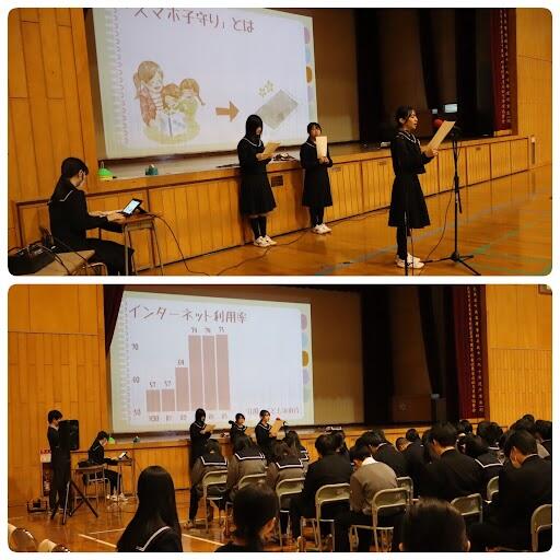 今年も国際流通科集会を2/13(金)に2つの体育館を利用し開催されました。5時間目は3年生の課題研究各クラス代表に選ばれたグループが1、2年生に向けて研究成果を発表しました。今年度は3年1組代表「スマホ育児」と2組代表「私たちができるリサイクル」のグループの皆さんが後輩たちのために家庭学習期間にも関わらず登校してくれました。後輩たちにとって1年後、2年後の自分達をイメージできる機会になったと思います。問いの設定からデータの収集の加工、分析、結論までの流れをイメージするには、この上ない見本になったことと思います。3年生の2つのグループのみなさん、本当にありがとうございました。2年生の皆さん、いよいよ春から課題研究が始まりますよ。