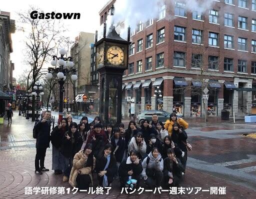 教養科の生徒24名が参加しているカナダ語学研修6日目の土曜日は、普段の語学学習からは少し離れて終日ツアーです。まず、市内観光の一環として、歴史的なガスタウンへ。生徒たちは、蒸気時計の前で揃って記念撮影をしました。