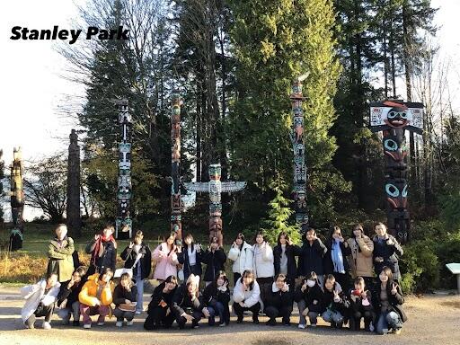 次にバスで移動し、緑豊かで美しいスタンレーパークへ。ここでは、先住民の歴史と文化が詰まったトーテムポールの前で記念撮影。さらに、海を挟んでダウンタウンのビル群を望む絶景スポットを訪れました。雨予報を覆すように奇跡的に晴れ間が広がり、生徒からも喜びの声が上がりました。