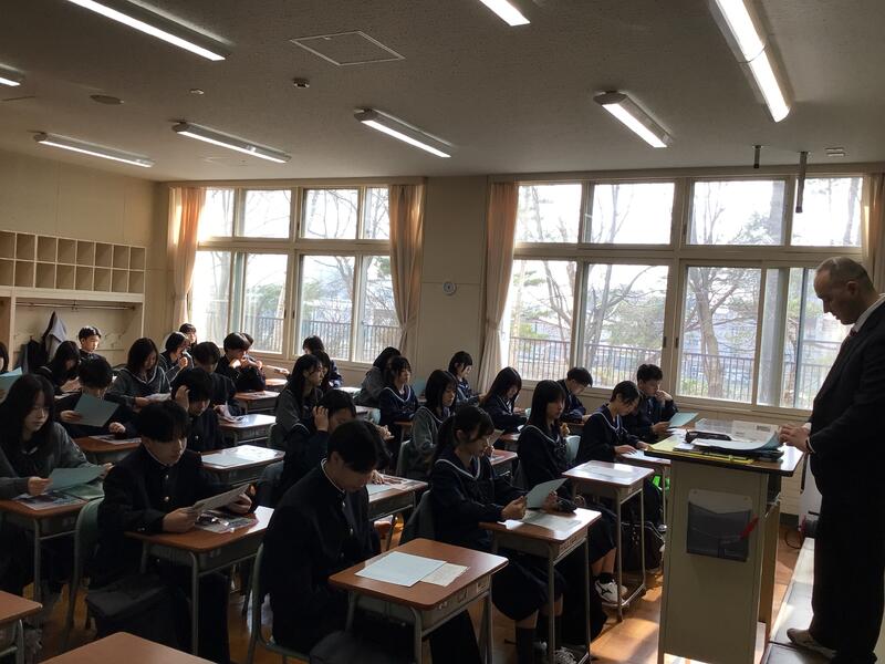 プログラムは、国際交流担当教員による「Hello!」という元気な挨拶からスタート。最初は控えめだった生徒たちも、2度目の呼びかけには力強い「Hello!」で応えてくれ、会場は一気に活気づきました。