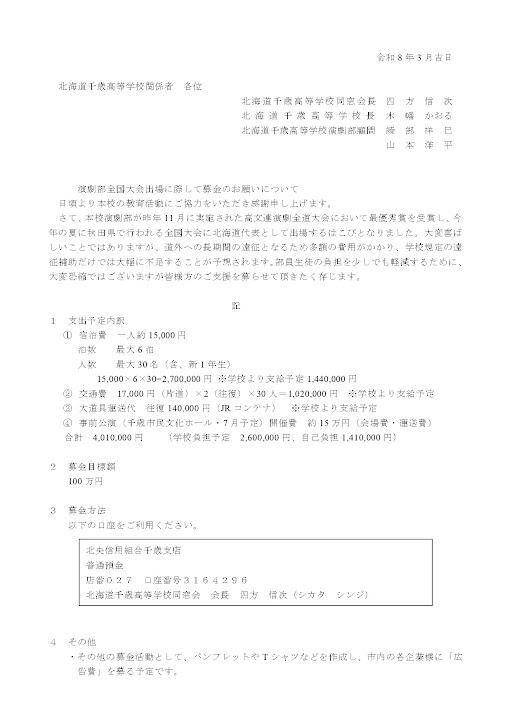 演劇部全国大会出場に伴うご寄付のお願いです。