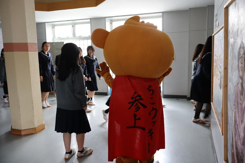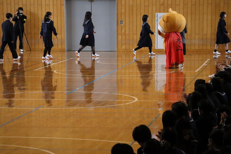 対面式のために体育館へ向かう新入生を出迎えたのは、本校公式キャラクター「ちこウッキー」