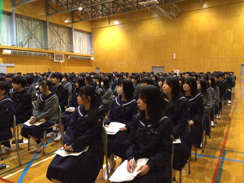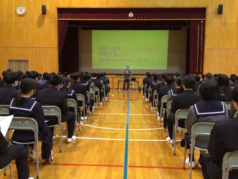 4月9日の5校時、新入生オリエンテーションの一環として、全学科の生徒を対象とした国際交流プログラムの説明会を体育館で行いました。
