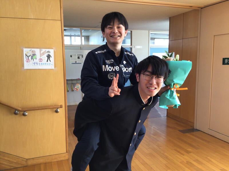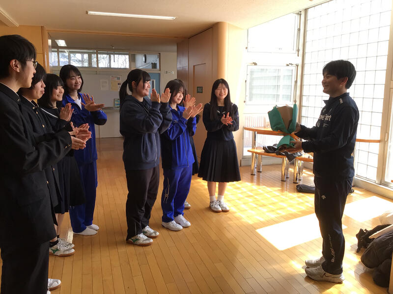 このたび、1年間お世話になった2年3組副担任の青木先生が転勤されるにあたり、担任の先生がクラスメートに呼びかけたところ、春休みにもかかわらず、8名の生徒が学校に集結!みんなで感謝の気持ちを込めて花束を贈りました。みんな優しい心を持っていて頼もしく感じました。その感謝の心を忘れずにいてほしいです。青木先生!新天地でもご活躍を応援しています!