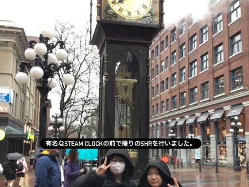 今日は、授業が早めに終わったため、みんなで観光名所であるガスタウンに行きました。語学研修先のEFの授業は、レベル別でバラバラの授業になるため、みんなで集まって何かをする機会が少ないことから、担任の小林先生の発案で急遽行うことにしました。バンクーバーはこの時期、雨が降ることが多いらしく、今日も雨で気温も低い中でしたが、みんなでガスタウンを満喫しました。ガスタウンは、バンクーバーでおそらくもっともよく知られている観光地で、蒸気時計(Steam Clock)が有名です。学校から徒歩10分ほどの立地にあることもあって、遠足気分で生徒で列をなして向かいました。蒸気時計は、15分に1回蒸気の力で汽笛のような音を出すのが特徴的で、みんな「もうすぐ鳴りますよ!」と興奮した様子でした。1時間半ほどガスタウンをそれぞれで散策し、家族や友人におみやげを買ったりしていました。最後は、蒸気時計の前で帰りのSHRをしました。少し、気分転換になったかなと思います。そろそろ、疲れもたまってくる頃です。休める時には休んで、生徒には最後まで完走してもらいたいものです。