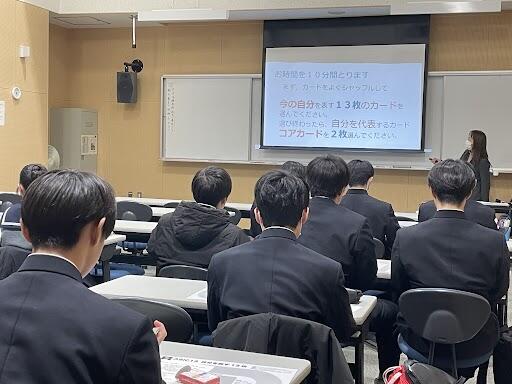 同期生の発表を緊張感を持って聴く姿が印象的でした。発表者の皆さんは進学先を卒業した後に、自分がどのようにその職業に就くのかを大変わかりやすく解説をしてくれました。就職をする人は業界研究に留まらず、雇用条件などを紹介する人もいましたね。