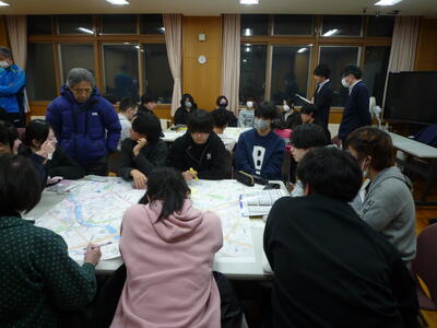 令和8年2月6日(金)1・2校時は、千歳市防災学習交流施設係長の川手さん、英語の発音が素晴らしい中村さん、松田さんの3名の職員の方をお迎えし、DIG(Disaster  imagination game)を学年ごとに体験しました。  千歳市の大きな地図を囲み、震度6強の地震が現在の時間(冬、寒さの中)に起こったことを想定しながら作業を進めました。